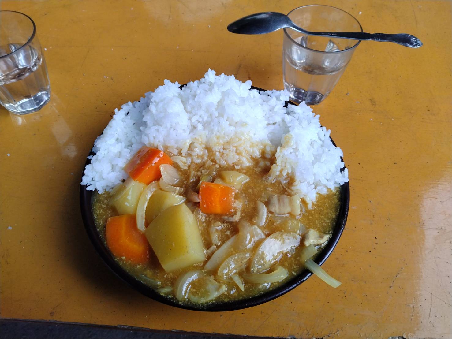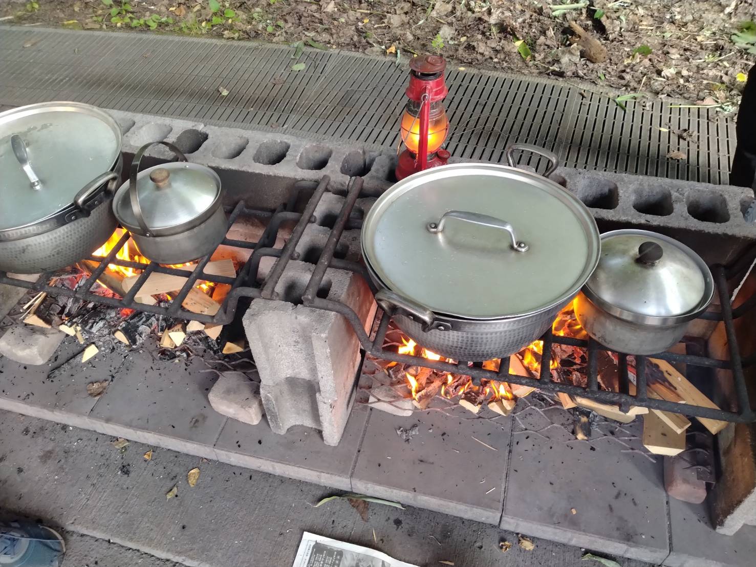 おじさん達が必死に棒を回す間、ガールズがメタルマッチで火を確保してくれてました。 その火を使って炊事開始です。薪を割るところから始まり、具材切って米炊いてカレーを作ります。