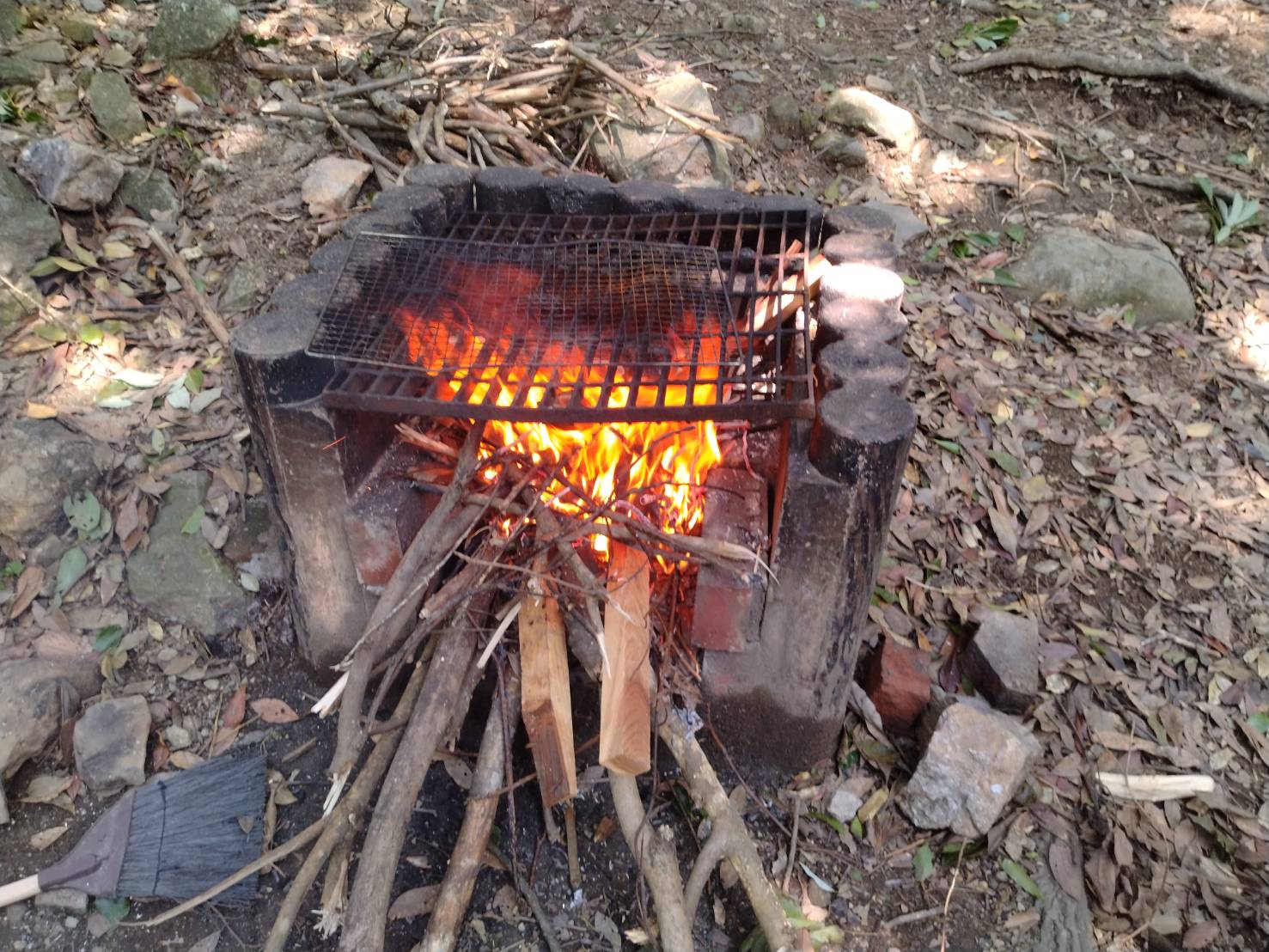 まずは懸命に木を拾いました。 一応薪も購入したんですが、量が心許ないんで大切に使うためです。 生木や湿り木も多かったんで着火も一苦労です。 N君とはよくアウトドアで遊びますが、基本的に雑なBBQしかしないんで 2人とも特に技術があるわけでもないです。